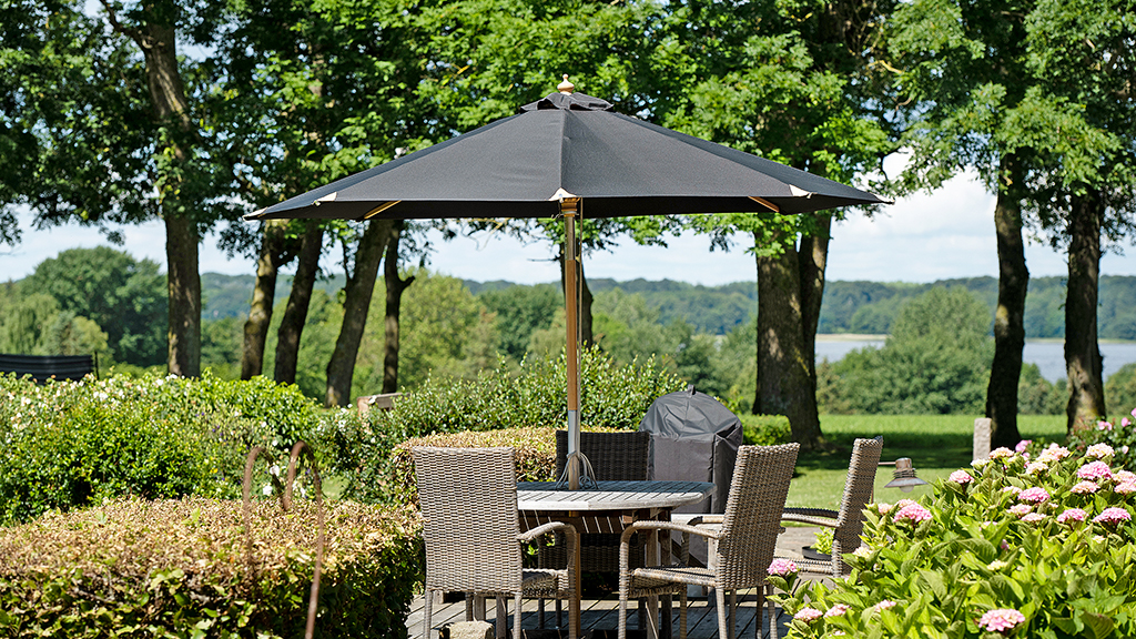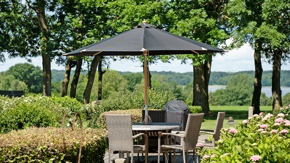 Herrlicher Hof nahe des Golfplatzes, mit privatem Strand und Aussicht über den Gamborg Fjord.